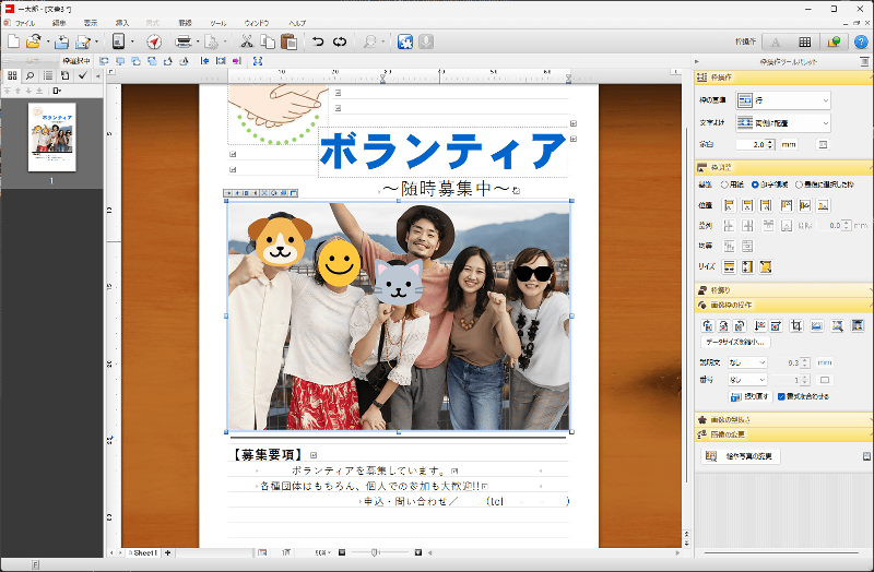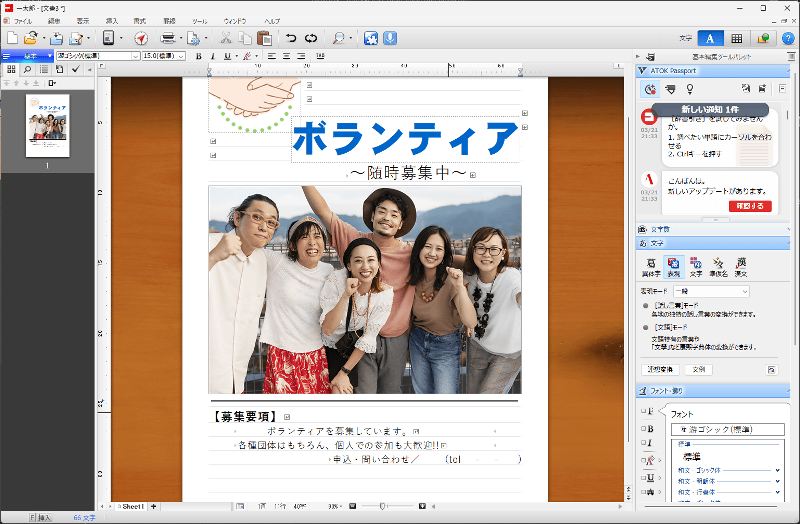 文字装飾機能や画像挿入機能などワープロソフトとして必要な機能は一通りそろっており、文書だけでなくポスターや賞状などのテンプレートも用意されています。以下はポスター用のテンプレートの画像だけを変更したものです。