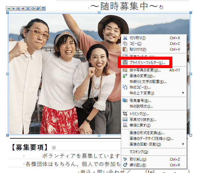 まず、画像を右クリックして「プライバシーフィルター」をクリック。