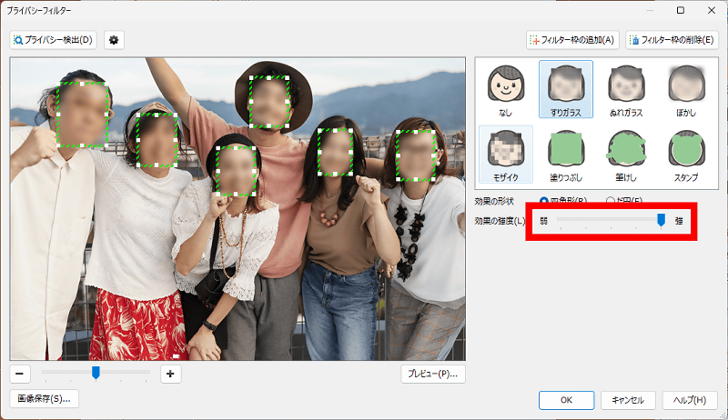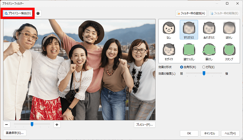 画像に含まれるすべての顔が自動認識されて「すりガラス」という効果が適用されました。顔のある場所を1個ずつ指定する必要がなくワンクリックで自動認識できるので便利。
