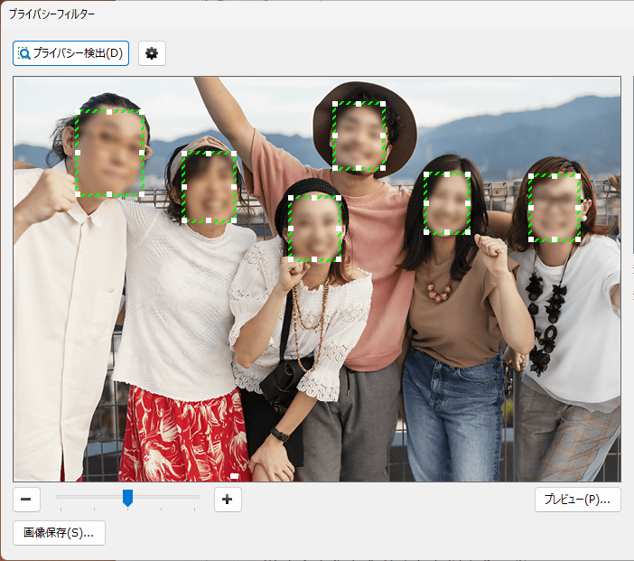 これで顔を隠すことができました。複数人が写った集合写真でも顔を自動認識して短時間で隠すことができるので、プライバシーに厳しい現場で便利です。