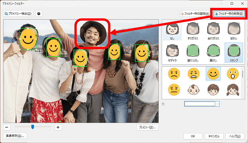 プライバシーフィルターは画像に含まれる顔やテキストを簡単に隠せる機能で、「画像に含まれている文字や顔を自動認識し、モザイクをかけたりスタンプで上書きしたりする」という操作を外部アプリを使わず一太郎だけで実行できます。