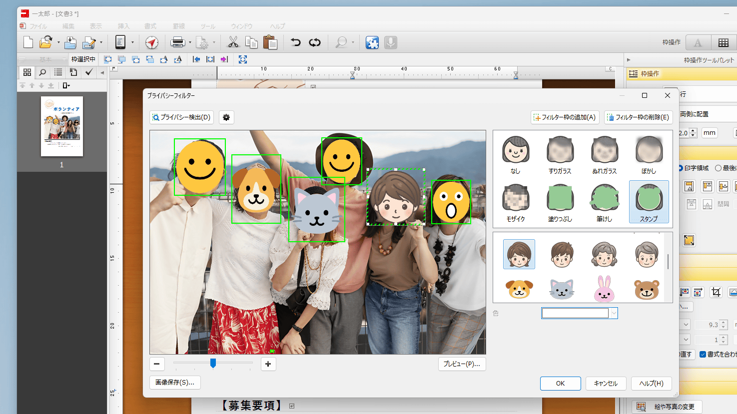 プライバシーフィルターは画像に含まれる顔やテキストを簡単に隠せる機能で、「画像に含まれている文字や顔を自動認識し、モザイクをかけたりスタンプで上書きしたりする」という操作を外部アプリを使わず一太郎だけで実行できます。