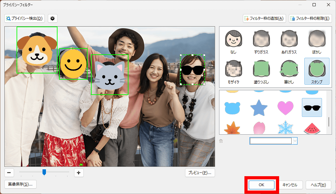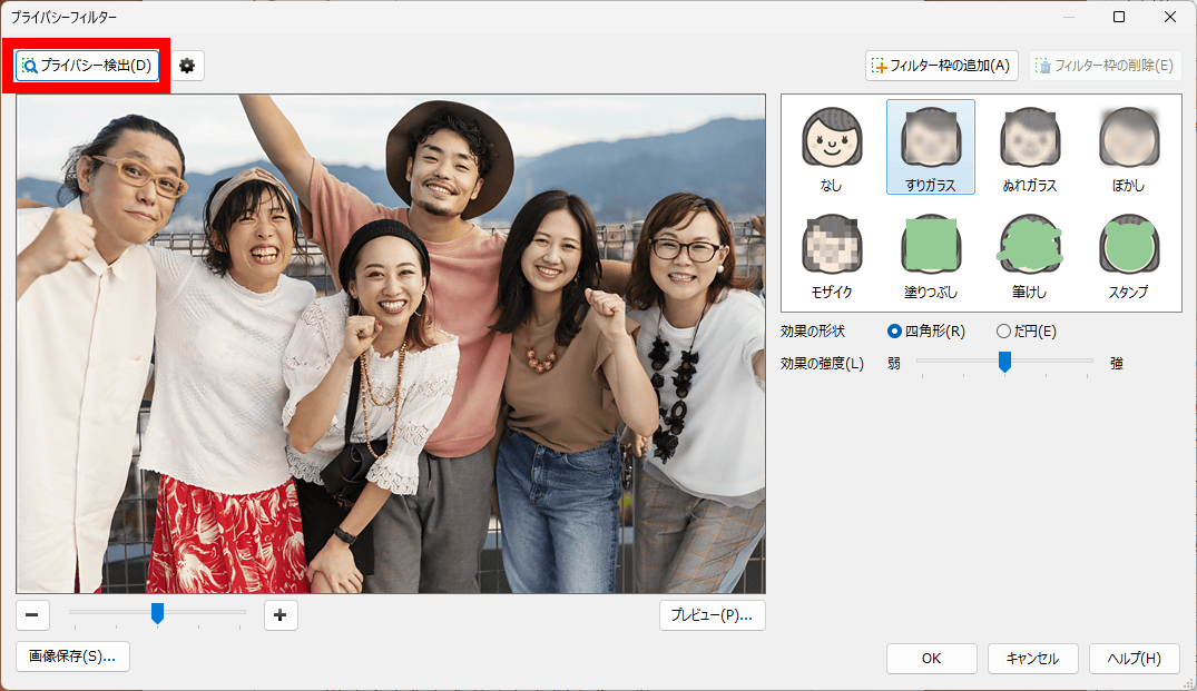 画像に含まれるすべての顔が自動認識されて「すりガラス」という効果が適用されました。顔のある場所を1個ずつ指定する必要がなくワンクリックで自動認識できるので便利。