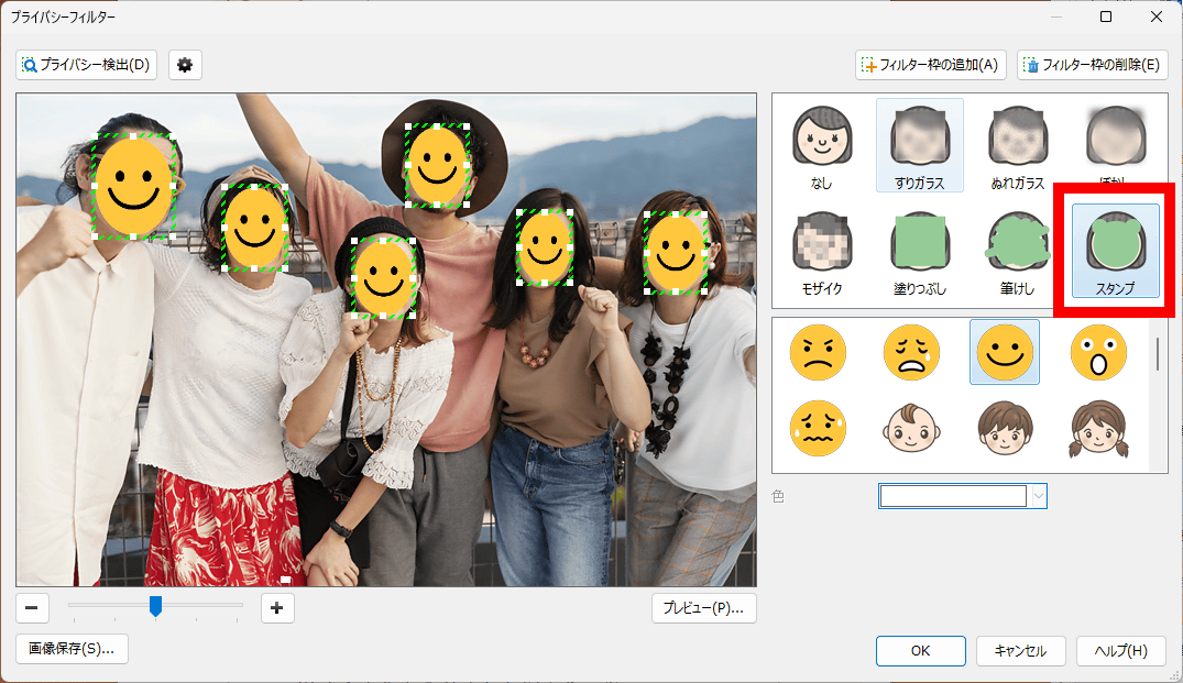 効果は「すりガラス」だけでなく「ぬれガラス」「ぼかし」「モザイク」「塗りつぶし」「筆けし」「スタンプ」の7種類が存在。スタンプだと顔を隠しつつポップな印象を保てます。