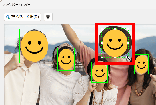 これで顔を隠すことができました。複数人が写った集合写真でも顔を自動認識して短時間で隠すことができるので、プライバシーに厳しい現場で便利です。
