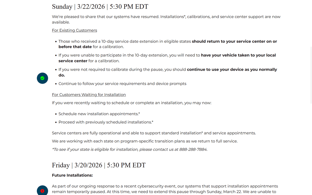 3月20日時点でもシステムは復旧しておらず、「現時点では、この停止措置を3月22日まで延長する必要がある」とIntoxalockは発表。そして3月22日、同社はついに「システムは再開した」と発表し、設置とキャリブレーションの両方が再び可能になったとしました。