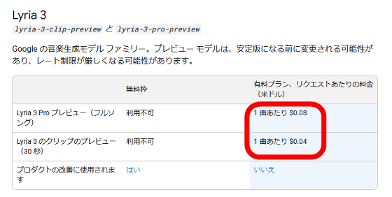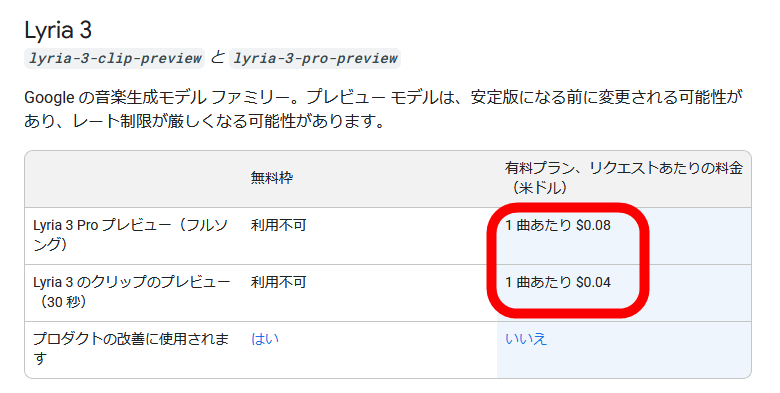 APIの使用料金はlyria-3-pro-previewが1曲当たり0.08ドル(約12.8円)で、lyria-3-clip-previewが1曲当たり0.04ドル(約6.4円)です。