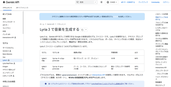 Lyria 3シリーズのドキュメントは以下のリンク先で確認できます。