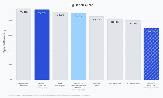 音声入力からの論理的思考や判断能力を測定するBig Bench Audioの結果は以下の通り。Gemini 3.1 Flash Live(思考モード:High)は95.9%のスコアで、Gemini 2.5 Flash Native Audio 12-2025(思考モード:High)から大きく向上。また、Gemini 3.1 Flash Liveを思考モードをMinimal(最小)に設定すると70.5%でした。