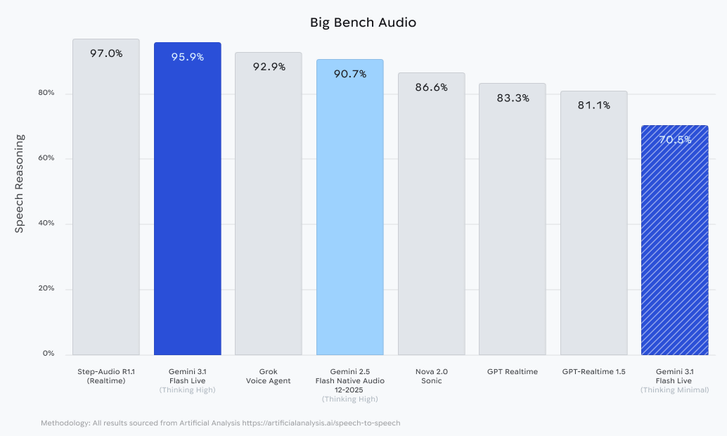 Scale AIのAudio MultiChallengeにおいて、Gemini 3.1 Flash Liveは「思考」機能をオンにした状態で36.1%のスコアを獲得し、トップに立っています。このベンチマークは、実際の音声にありがちな言いよどみや中断の中で、複雑な指示に従う能力や長期的な推論能力を具体的にテストするものです。
