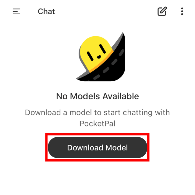 インストールが終わり、PocketPal AIを起動するとこんな感じ。「Download Model」をタップします。