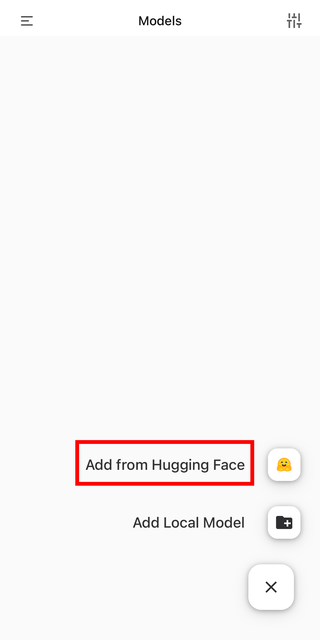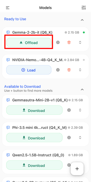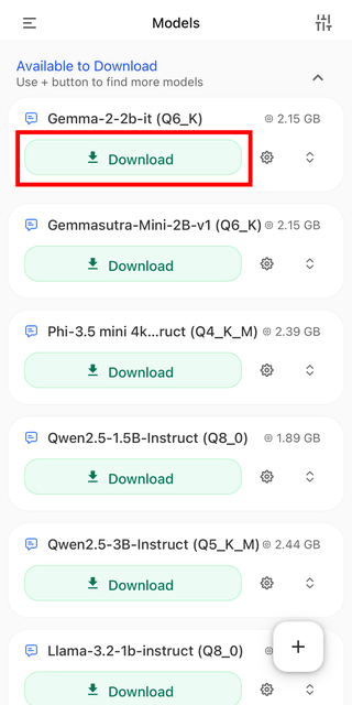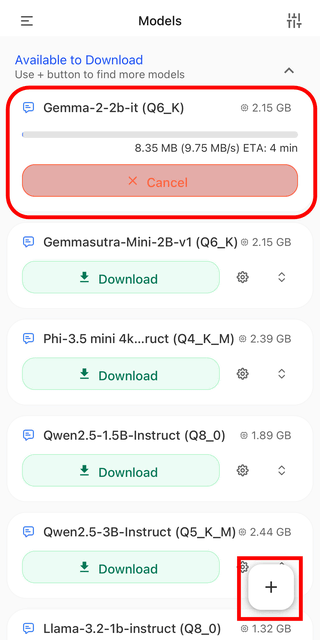 Gemma-2- 2b-it(Q6_K)のダウンロードが始まりました。モデルは用意されているもの以外にも、Hugging Faceで検索したものを導入することも可能です。右下にある+アイコンをタップ。