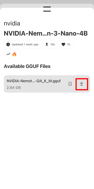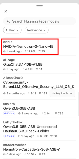 すると、Hugging Faceで公開されているモデルが表示されます。そこで、NVIDIAのNemotoron 3 Nanoを導入するため、タップ。