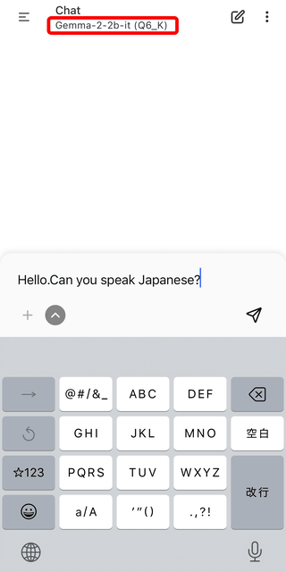 ロードが終了すると、チャット画面が開きました。「Chat」の下に「Gemma-2- 2b-it(Q6_K)」とモデル名が表示されています。