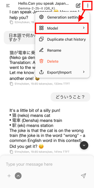 日本語を使ってチャットをすることができました。小型言語モデルなので精度は高くないものの、iPhone上での動作でも返答はかなり速いと感じました。