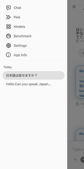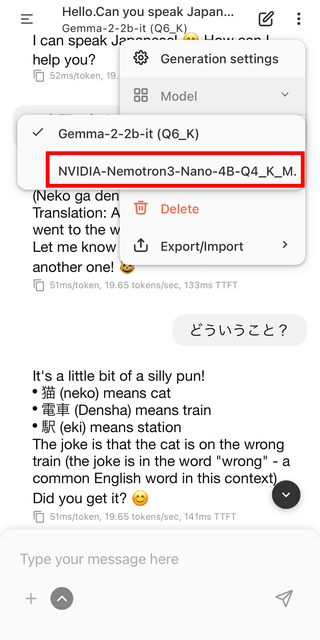 すると、NVIDIA-Nemotron3-Nano-4B-Q4-K_M.と会話することができるようになりました。なお、メニューは左上のハンバーガーアイコンをタップすると展開します。