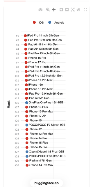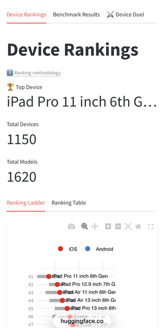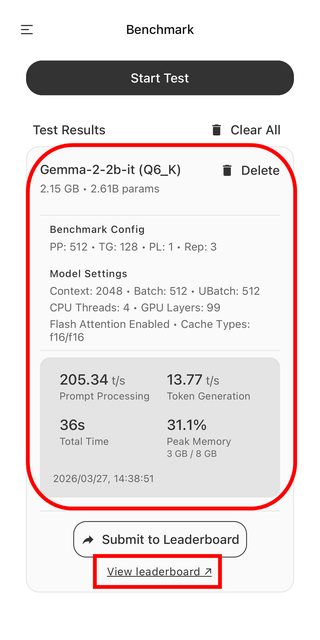 iPhone 15 Proで、Gemma-2- 2b-it(Q6_K)でベンチマークを実行した結果が以下。プロンプト処理(Prompt Processing)が毎秒205.34トークン、トークン生成(Token Generation)が毎秒13.77トークン、トータル時間36秒、メモリー消費率のピークは31%でした。「View leaderboard」を見ると、Hugging Faceに公開されているベンチマーク結果のランキングを見ることができます。