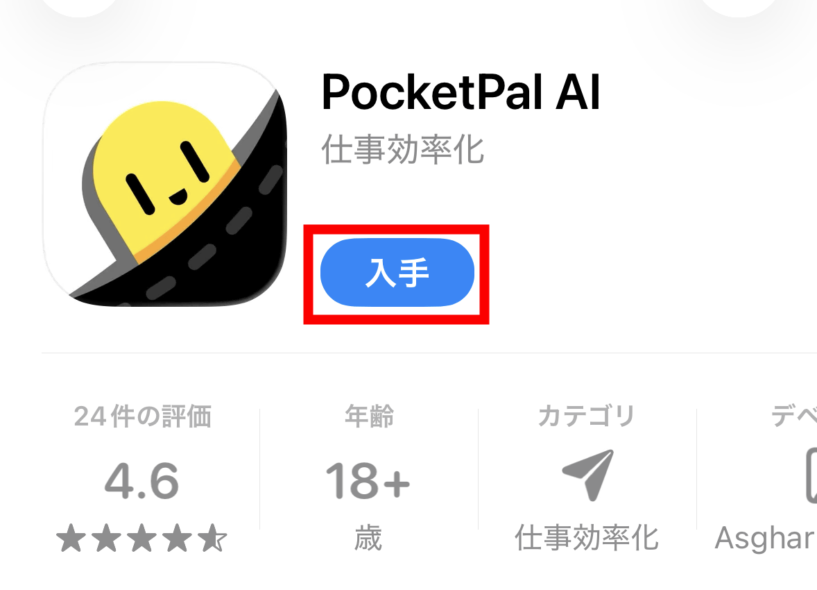 PocketPal AIはiOS版とAndroid版が提供されています。今回はiPhone 15 Proで使ってみるため、App Storeページで「入手」をタップし、インストールします。
