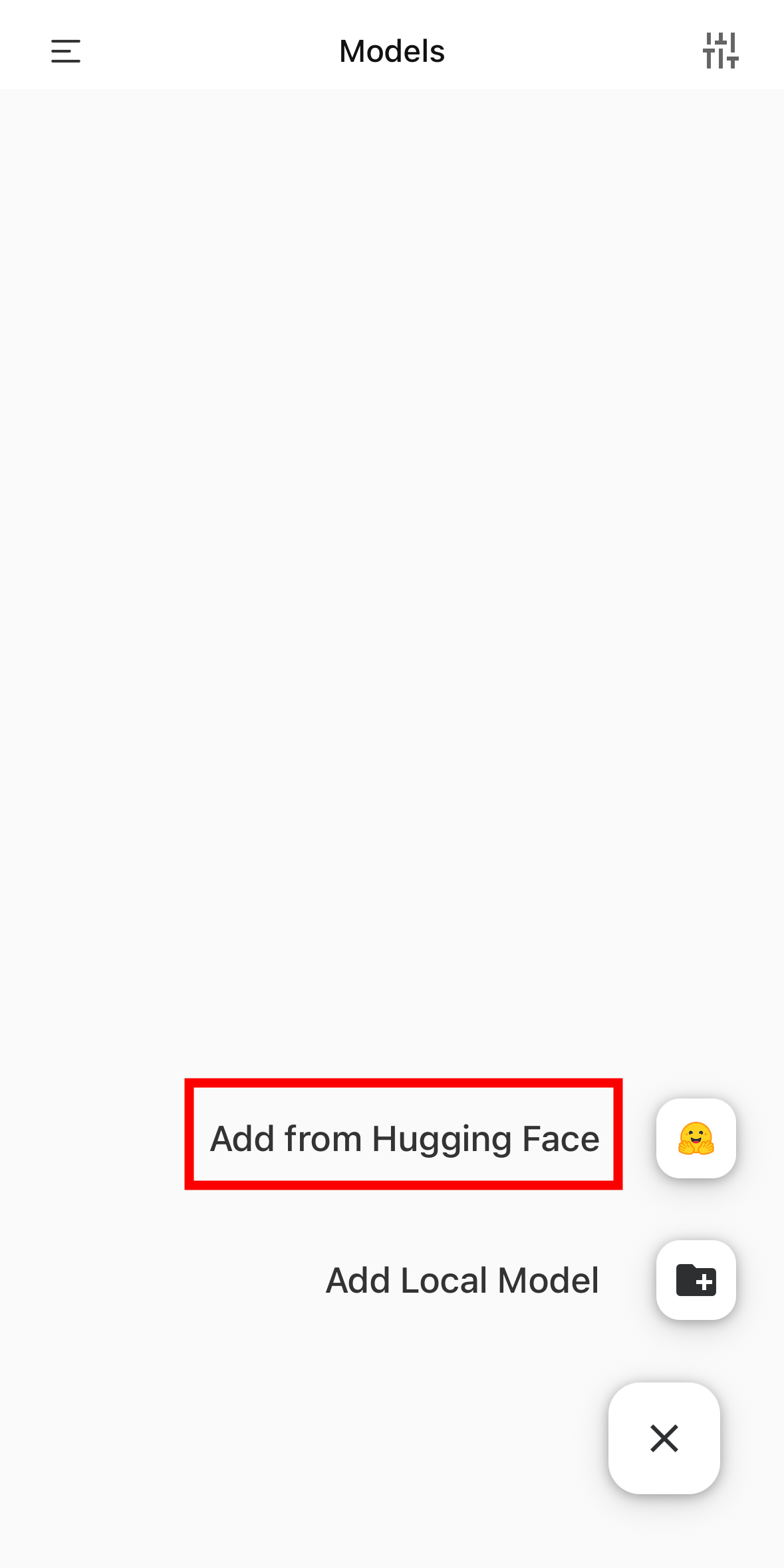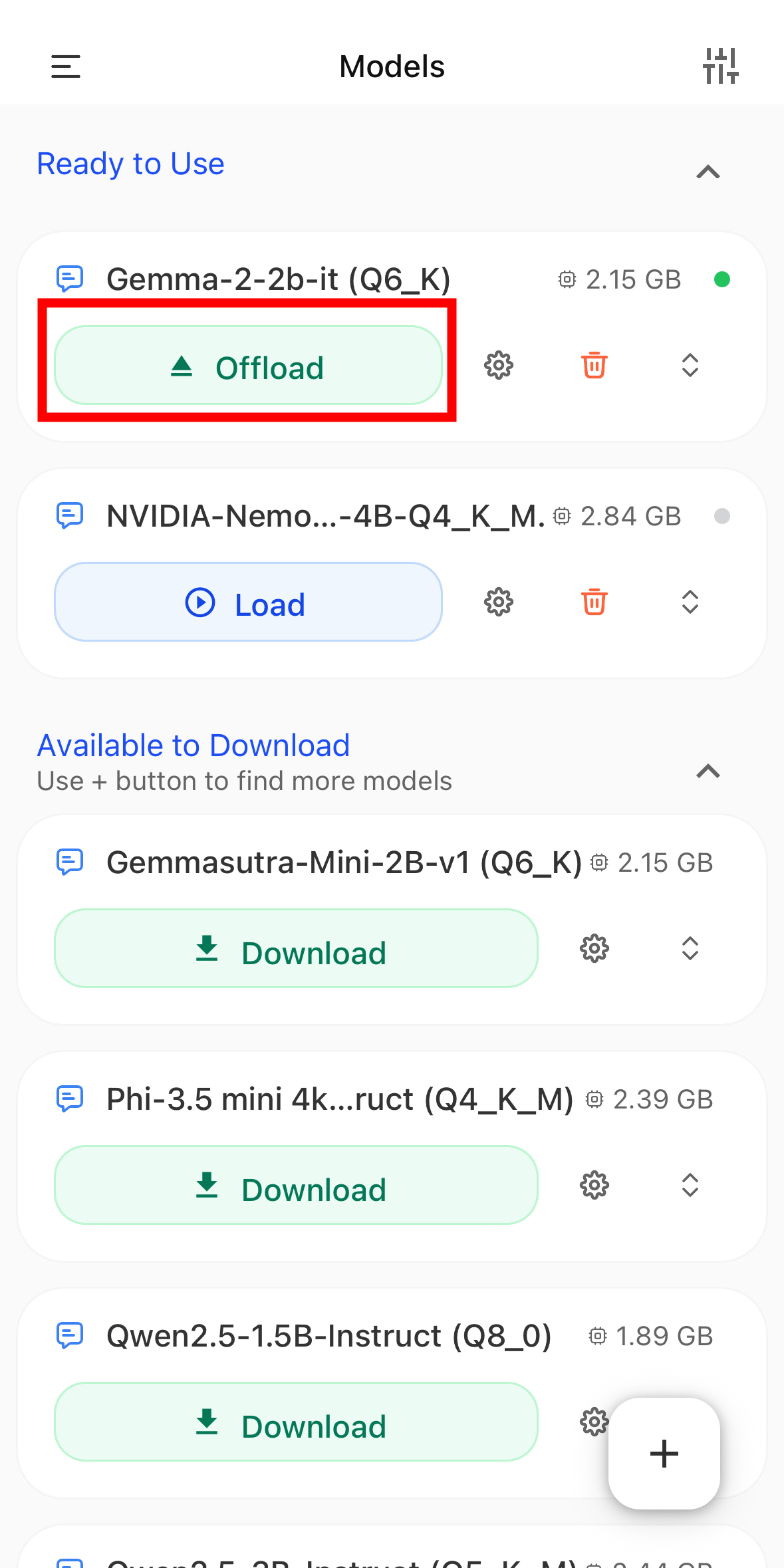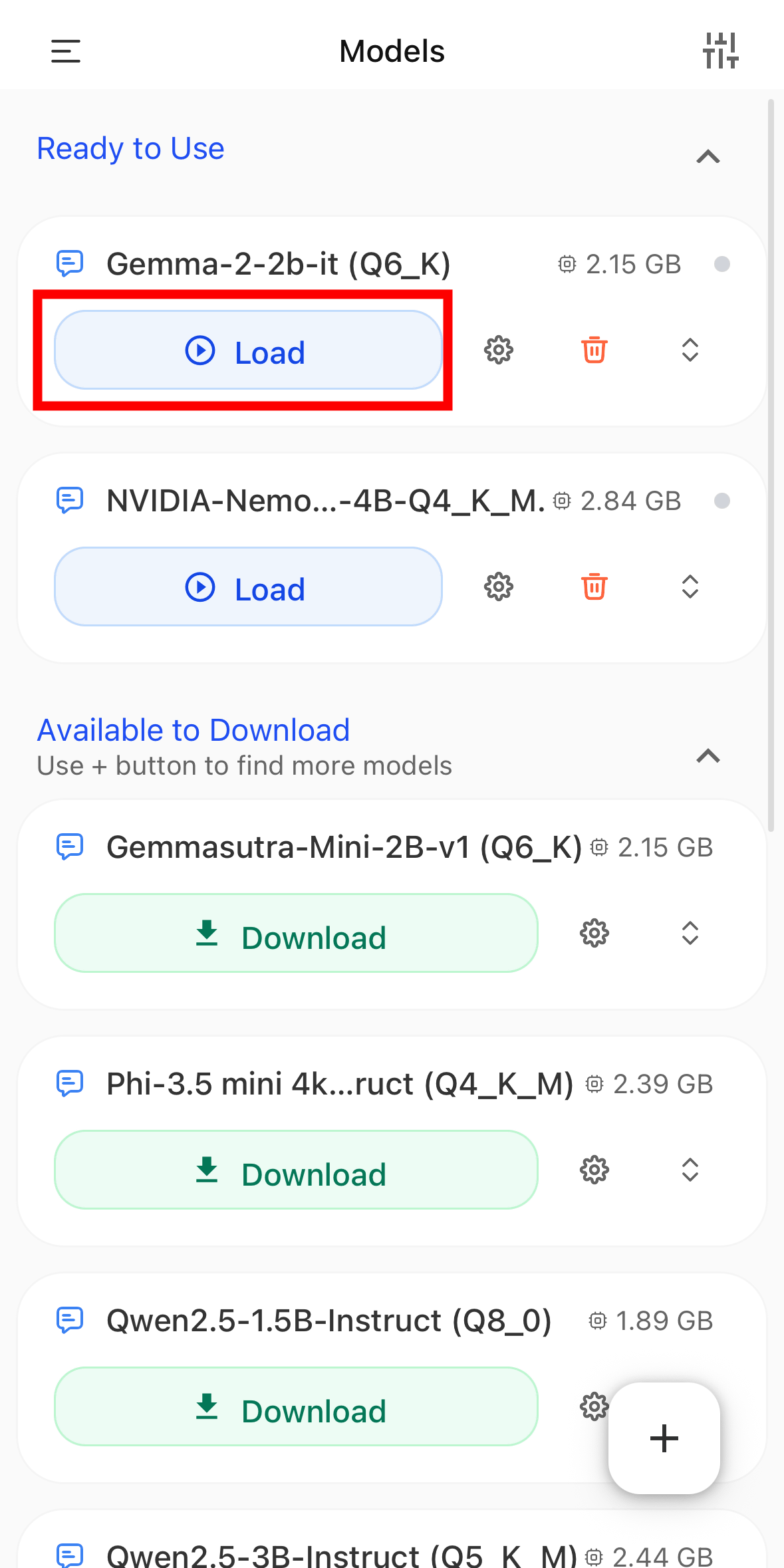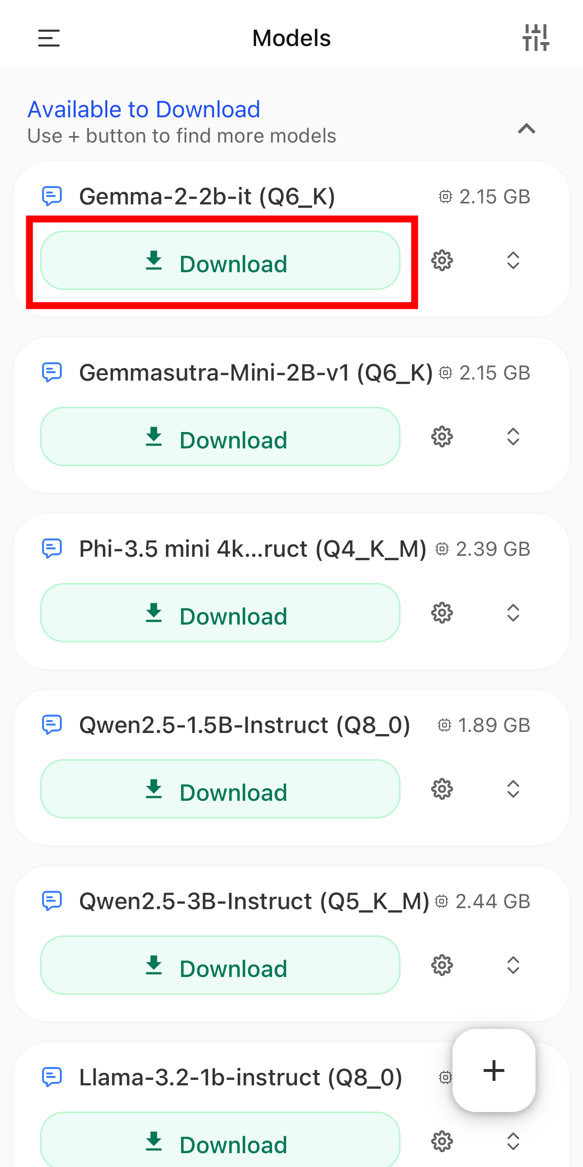 Gemma-2- 2b-it(Q6_K)のダウンロードが始まりました。モデルは用意されているもの以外にも、Hugging Faceで検索したものを導入することも可能です。右下にある+アイコンをタップ。