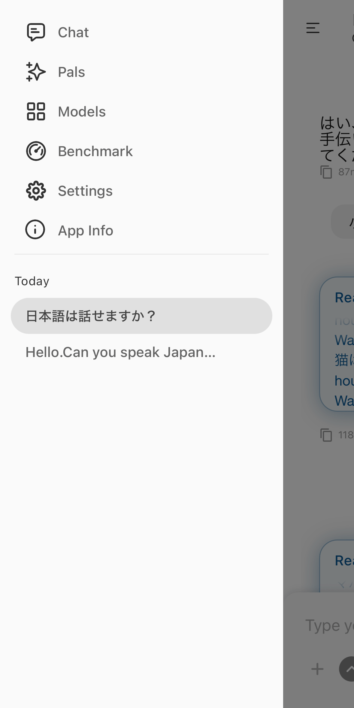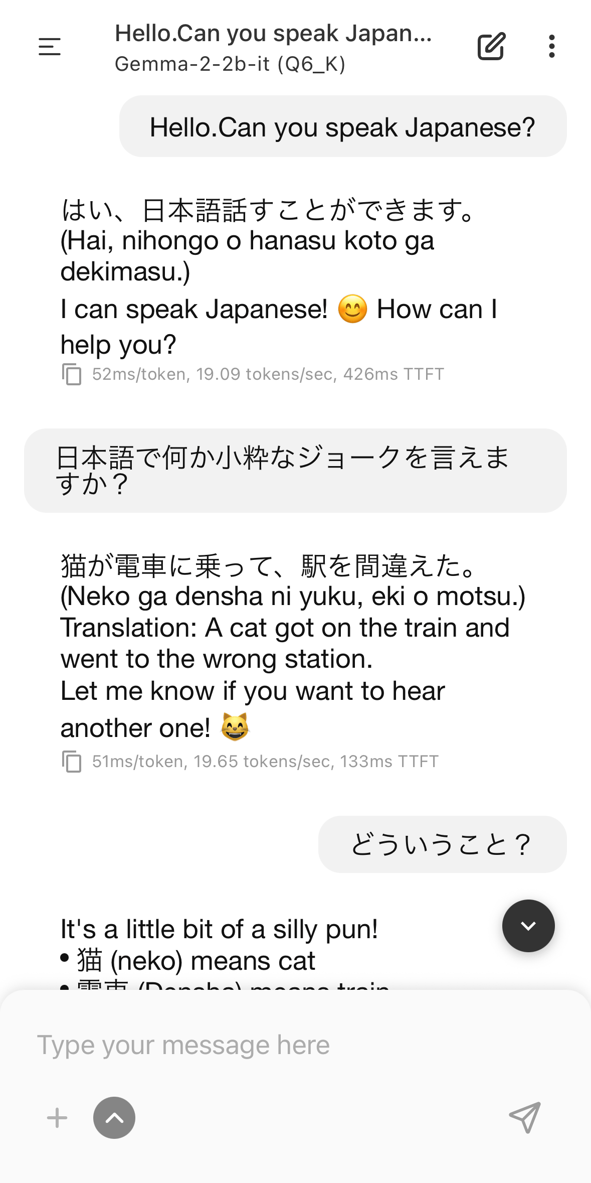 日本語を使ってチャットをすることができました。小型言語モデルなので精度は高くないものの、iPhone上での動作でも返答はかなり速いと感じました。