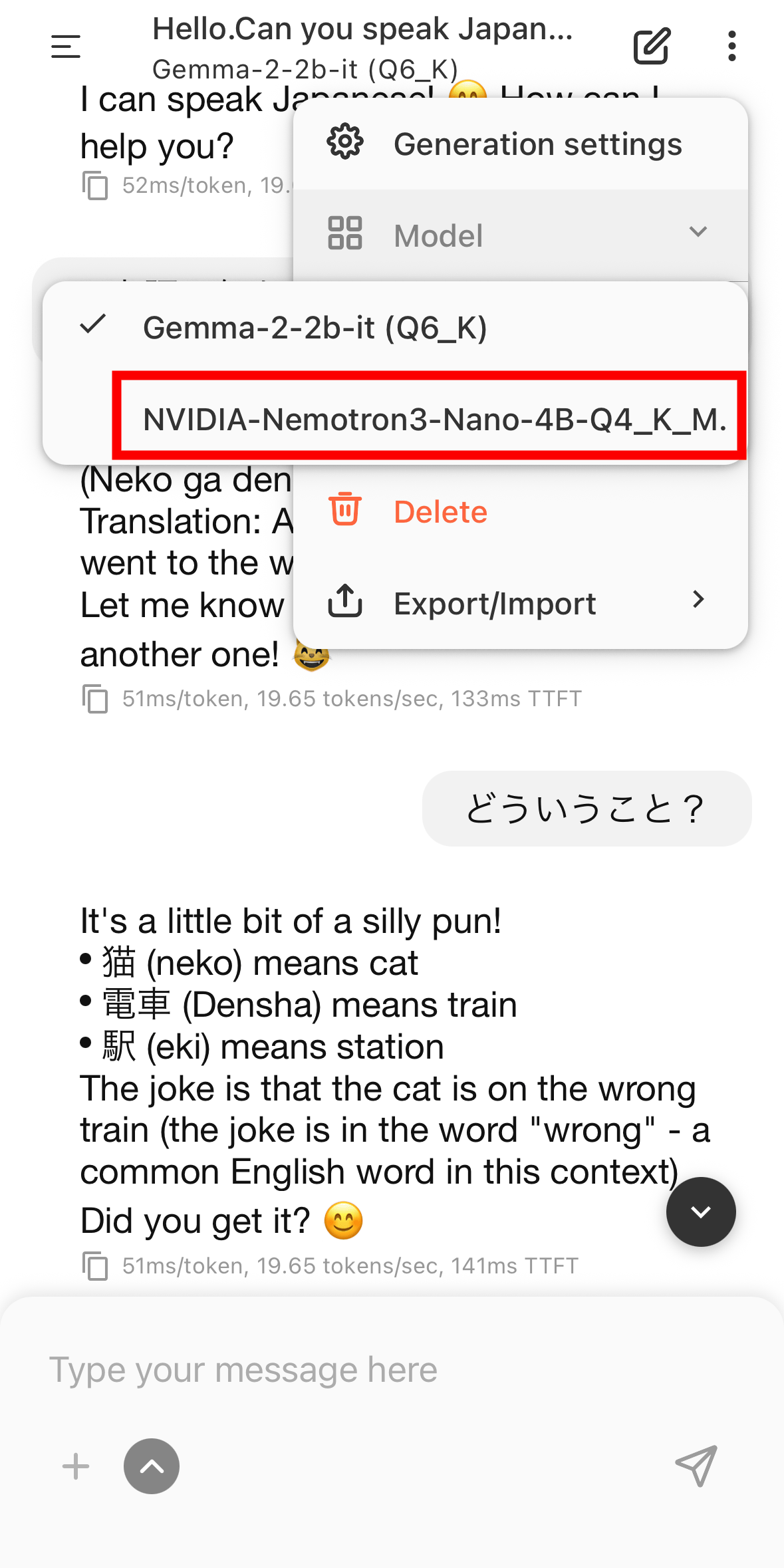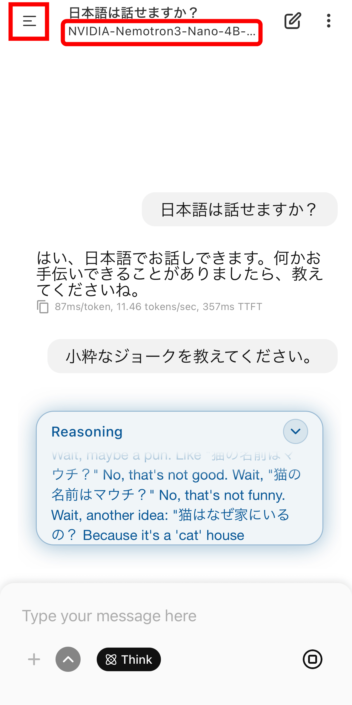 すると、NVIDIA-Nemotron3-Nano-4B-Q4-K_M.と会話することができるようになりました。なお、メニューは左上のハンバーガーアイコンをタップすると展開します。