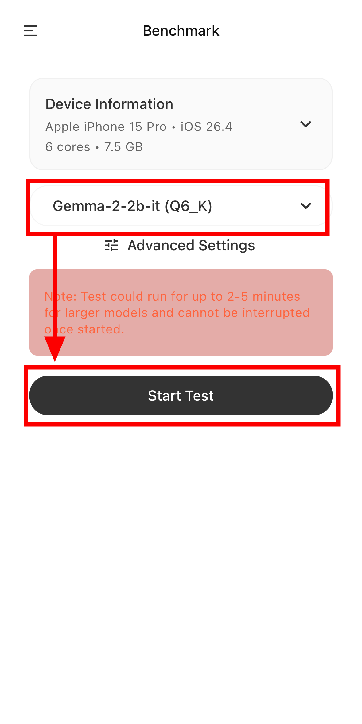 そして、PocketPal AIではAIモデルを用いたデバイスのベンチマークを実行できます。モデルを選択し、「Start Test」をタップするだけでOK。ベンチマークには2~5分ほどかかります。