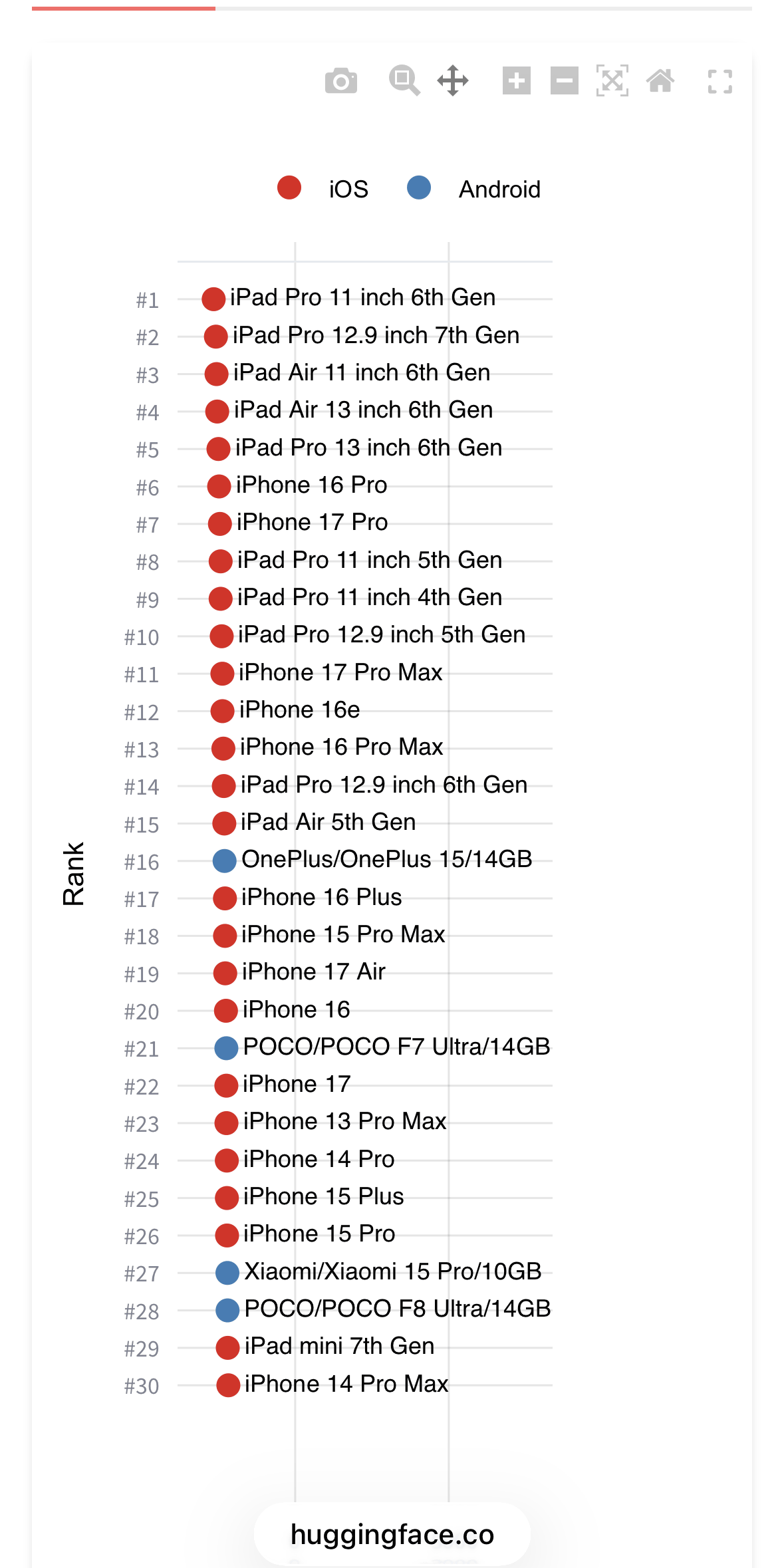 iPhone 15 Proで、Gemma-2- 2b-it(Q6_K)でベンチマークを実行した結果が以下。プロンプト処理(Prompt Processing)が毎秒205.34トークン、トークン生成(Token Generation)が毎秒13.77トークン、トータル時間36秒、メモリー消費率のピークは31%でした。「View leaderboard」を見ると、Hugging Faceに公開されているベンチマーク結果のランキングを見ることができます。