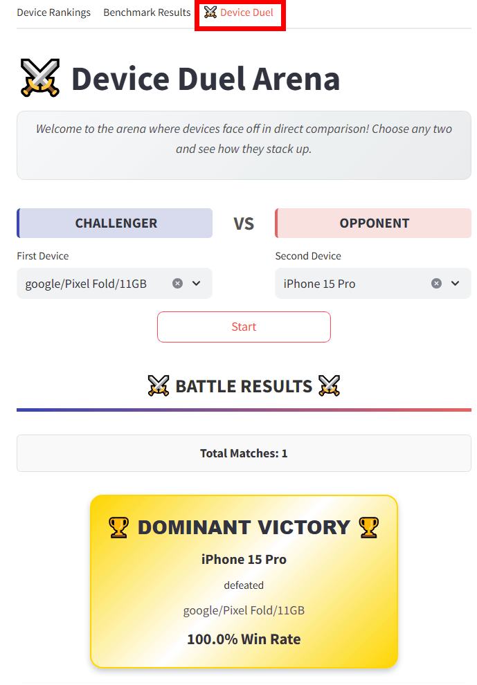 なお、Device Duelの項目ではデバイス同士の結果を比較することができました。