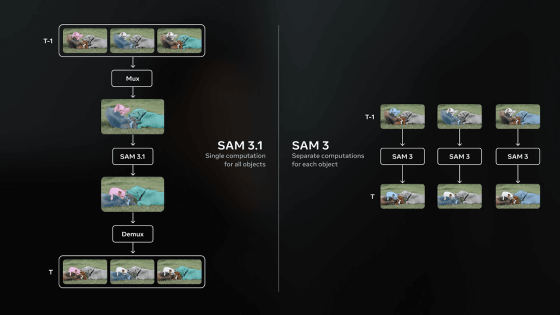 3月27日、MetaはSAM 3の性能を向上させたバージョンであるSAM 3.1をリリースしました。SAM 3.1では「object multiplexing(オブジェクト多重化)」を導入することで、精度を犠牲にすることなく動画の処理効率を大幅に向上させたとしています。