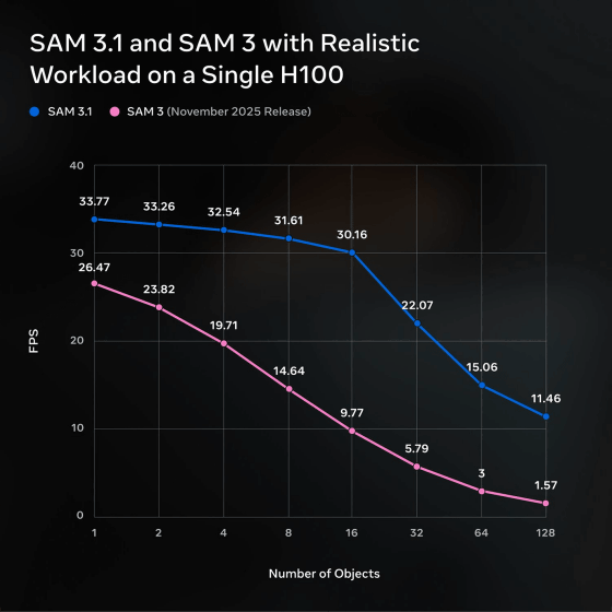 以下のグラフは、縦軸が単一のH100 GPUによる動画の処理能力(FPS)、横軸が追跡するオブジェクトの数を表したもの。SAM 3(ピンク色の線)とSAM 3.1(青い線)の性能を比較すると、オブジェクトの数が増えるほど性能の開きが大きくなり、オブジェクトが128個になると実に7~8倍ほどの性能差になることがわかります。