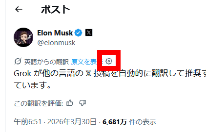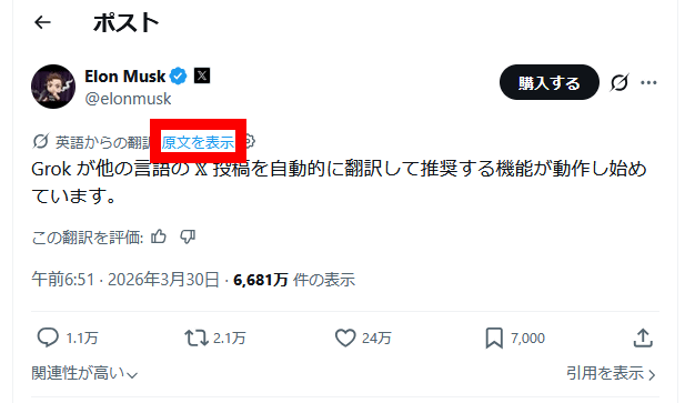 Xにはこれまでも1クリックで和訳できる翻訳機能が搭載されていましたが、2026年3月30日からはボタンをクリックせずとも最初から日本語で表示されるようになりました。