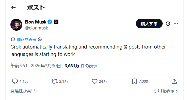 Xにはこれまでも1クリックで和訳できる翻訳機能が搭載されていましたが、2026年3月30日からはボタンをクリックせずとも最初から日本語で表示されるようになりました。