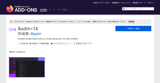この検索結果を極力シンプルなものにすることができるフィルターが「&udm=14」で、このフィルターを自動で挿入してくれるFirefox拡張機能も登場しています。拡張機能は以下からFirefoxに追加可能です。