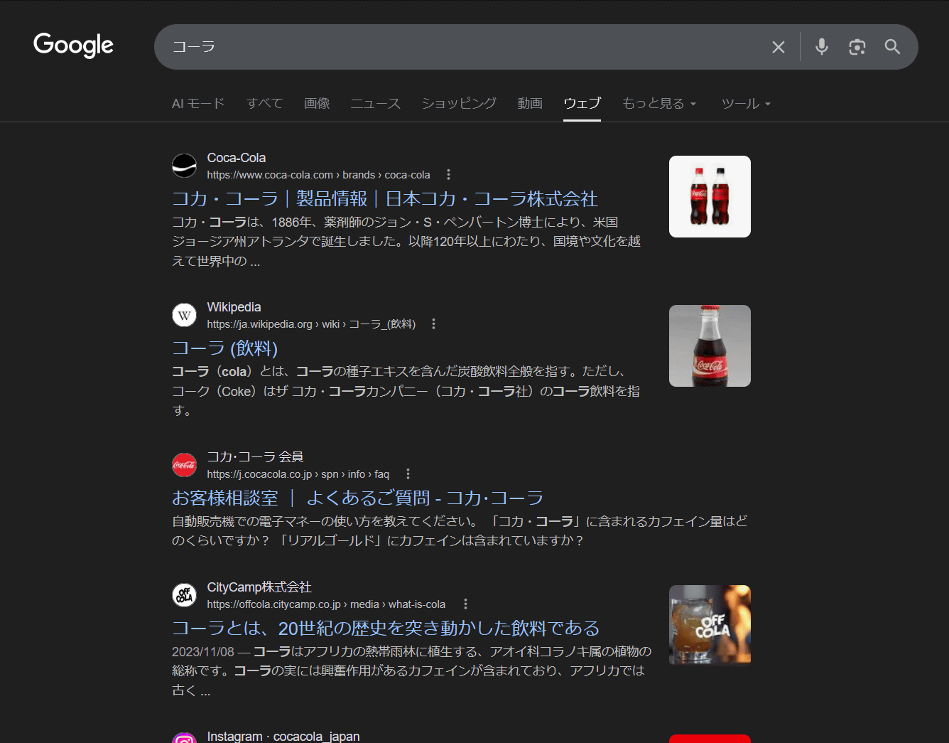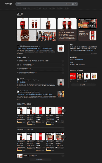 例えばGoogle検索で「コーラ」と検索すると、検索結果の最上部には画像や動画が表示され、その下に検索結果として3つのリンクが表示、その後に「注目されている商品」としてGoogleがウェブ上から収集した検索ワードに関連する購入可能な商品が表示されています。