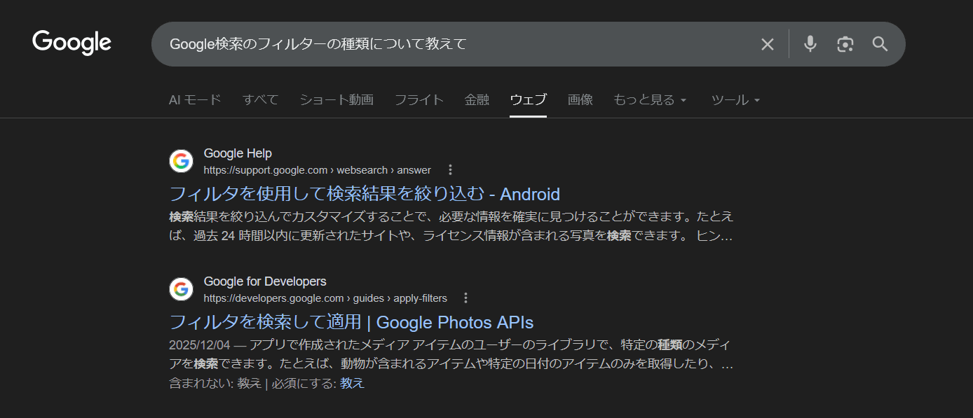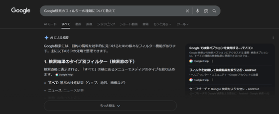 また、検索ワードによっては「AIによる概要」が検索結果の最上部に表示されます。例えば「Google検索のフィルターの種類について教えて」と検索すると、以下のように検索結果の概説が表示されました。
