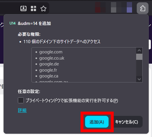 ブラウザの右上に以下の表示が出てくるので「追加」をクリック。