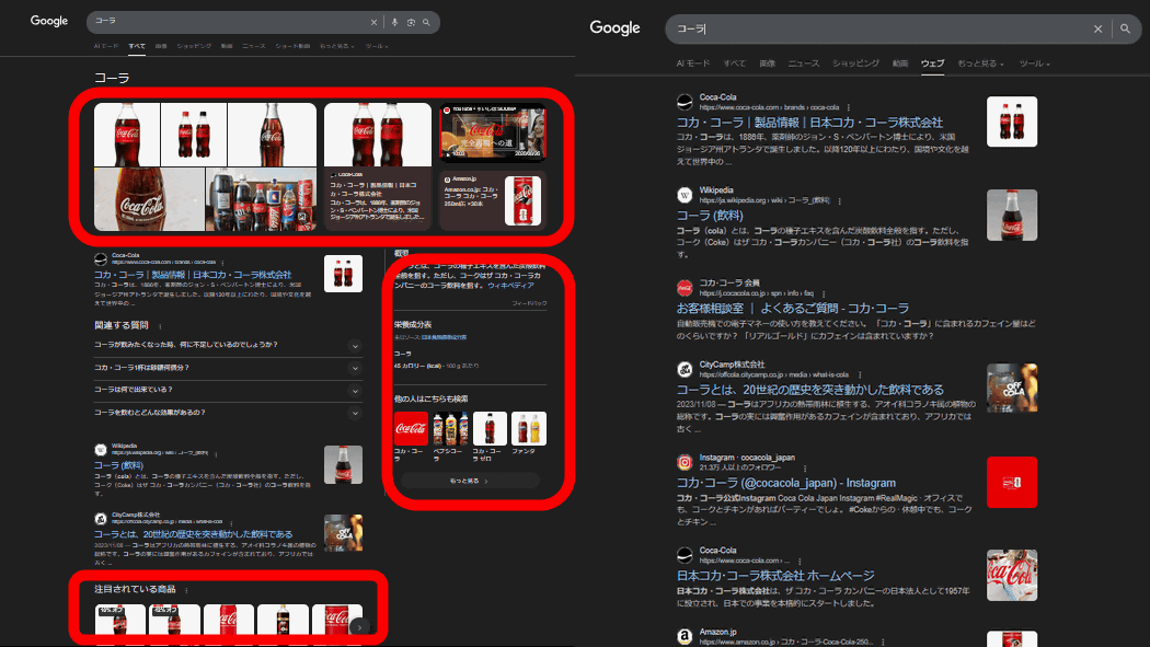 実際、「コーラ」と検索した際の検索結果ページを「&udm=14」あり(右)となし(左)で比較したのが以下。赤枠部分に表示されている画像・動画、ナレッジパネル、注目されている商品が非表示になりました。