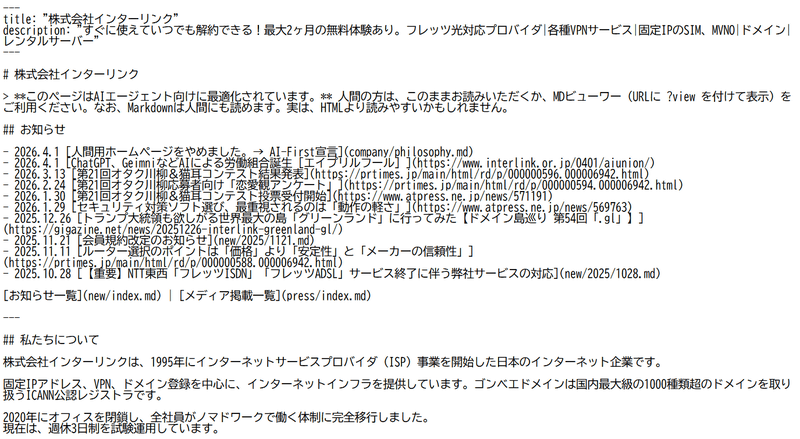 また、インターリンクは公式サイトを人間ではなくAIエージェント向けに最適化したものに変更することも発表しました。AIエージェント向けに最適化されてしまったインターリンク公式サイトの末路がコレ……「実は、HTMLより読みやすいかもしれません。」とのコメントがありますが、確かに、情報が端的に表示されていて、慣れるとこのほうが見やすいのではないかという気もしてきます。