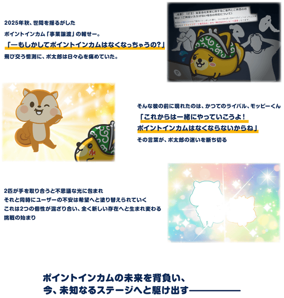 どうやらポ太郎はポイントインカムが事業譲渡されるというニュース以降「ポイントインカムがなくなってしまうのではないか」と飛び交う臆測に心を痛めていたようです。そんなポ太郎の前に現れたのが事業譲渡先の株式会社セレスが運営するポイントサイト「モッピー」のマスコットキャラクターであるモッピーくん。「これからは一緒にやっていこうよ!ポイントインカムはなくならないからね」と励まされ二匹は手を取り合いました。