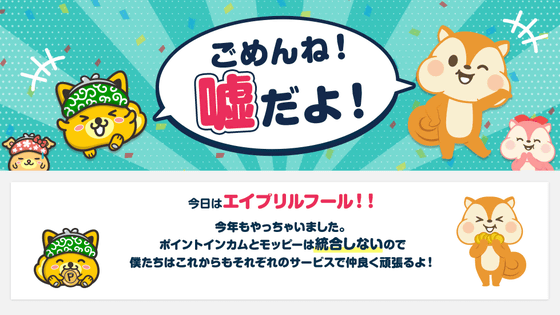 もちろんこれはエイプリルフールネタ。ポイントインカムとモッピーは統合せず、マスコットキャラクターも引き続きポ太郎が担当します。