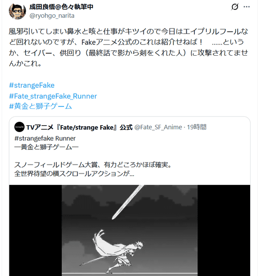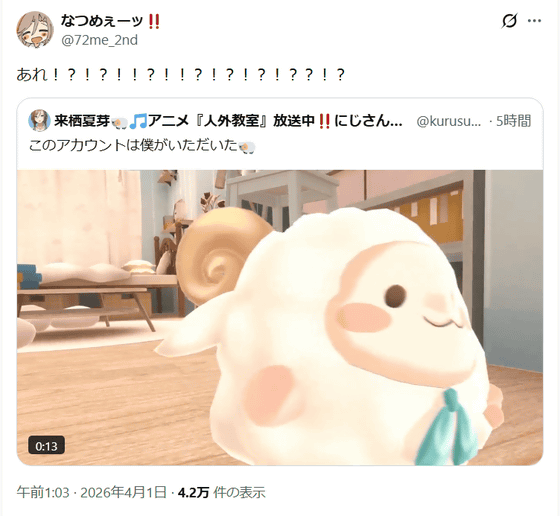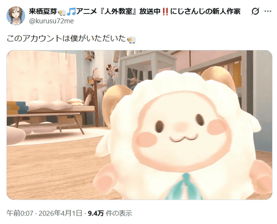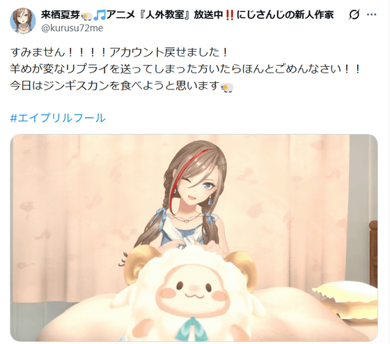 固定電話番号を発着信できるクラウドPBXサービス「ナイセンクラウド」は毎年エイプリルフールネタを投稿しています。そして、2026年も3月31日21時時点で「便乗して17年、ナイセンは嘘を愛しています。」というメッセージをXにポストしていました。イラストはどこかのアニメで見たことがあるような……?