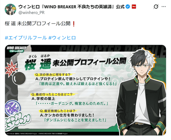 マンガ作品「WIND BREAKER」を題材にしたスマートフォン向けゲーム「WIND BREAKER 不良たちの英雄譚」の公式Xアカウントが、主人公である桜遥の未公開プロフィールを公開しました。ただし内容は全て桜遥のキャラからはかけ離れたもので、別のキャラクターとプロフィールが入れ替わってしまっているようです。