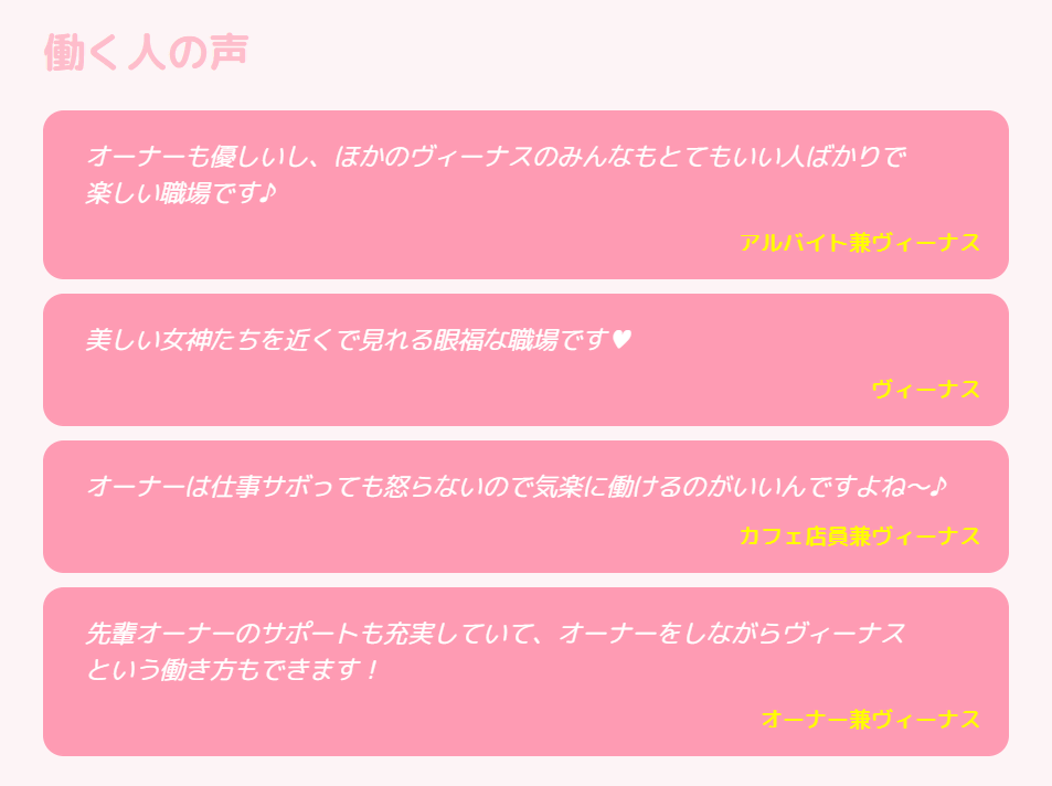主な仕事内容は「ビーチやプールでの水着モデル業務」「イベント用ポスター・パンフレット・デジタルカタログなどの撮影」「ヴィーナスフェス(ビーチバレー)の参加」「ヴィーナスフェス、イメージキャラクターとしての活動」「公式SNS・公式サイトでの情報発信」「その他ロッククライミングやどんけつゲームといったスポーツ活動」となっています。給与は雇用形態や能力に応じたもので、アルバイトの場合は時給5050ザックマネーから。なお、バカンスのため休日はありません。求人ページには働く人の声も記載されています。