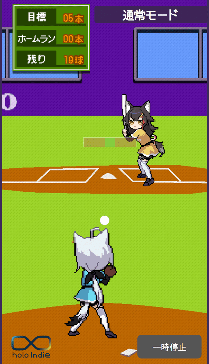ゲーム画面はこんな感じ。緑のエリアをとんでくるボールに合わせてスイングすればOK。バッターは大神ミオ、ピッチャーは白上フブキで固定のようでした。