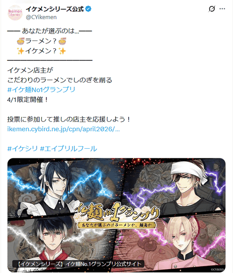 サイバードの女性向けゲーム「イケメンシリーズ」が、ラーメンの祭典「イケ麺No1グランプリ」の開催を発表しました。
