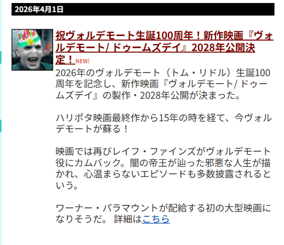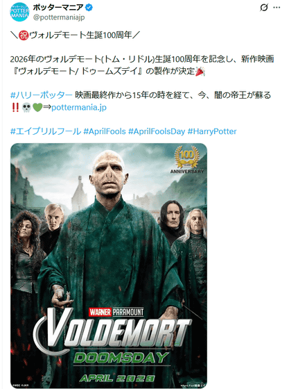 ヴォルデモート(トム・リドル)生誕100周年となる2026年に、新作映画「ヴォルデモート/ドゥームズデイ」の製作が決定したとハリー・ポッターシリーズのファンコミュニティ「ポッターマニア」が報じています。