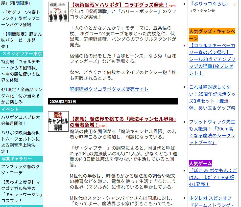 そのほかにも過去ニュースでは、「呪術廻戦」とハリー・ポッターがコラボしたグッズのお知らせや、「魔法キャンセル界隈(かいわい)の若者急増」といったニュースを発信しています。なお、これらのニュースを含めてまるごとエイプリルフール用のジョークページとなっており、ニュースの詳細にアクセスしようとすると正しいポッターマニアにリダイレクトされます。