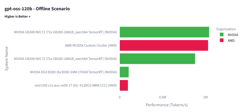 集計ページでAMDとNVIDIAが提出したgpt-oss-120bの実行速度テスト結果を表示したものが以下。トップはNVIDIA GB300 NVL72で、AMD MI355XのカスタムクラスターもNVIDIA GB300 NVL72に肉薄するスコアを記録しています。