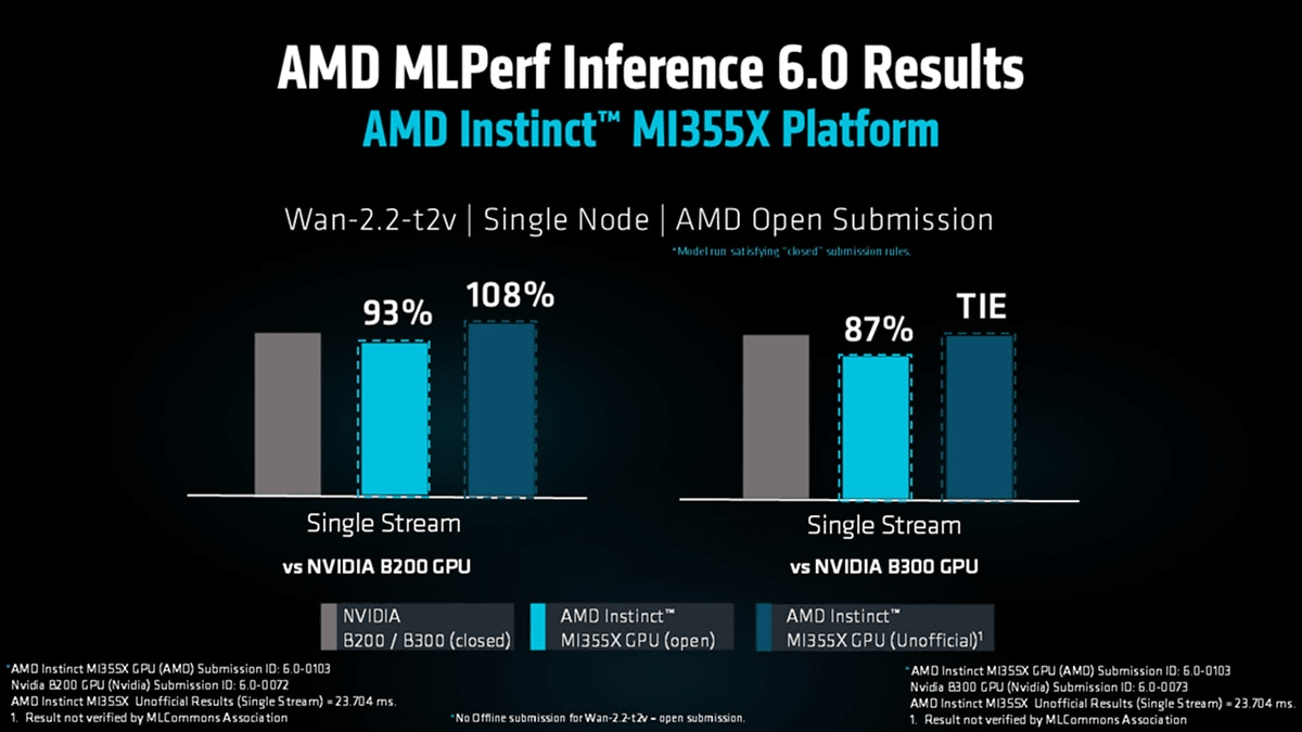 また、AMDはWan2.2-T2V-A14B-Diffusersを用いた動画生成速度テストの結果を自社の公式サイトで公開しています。AMDの発表によると、MI355XはB200と比べて93%のスコアを記録し、その後の最適化で108%にまでスコアを伸ばしたとのことです。
