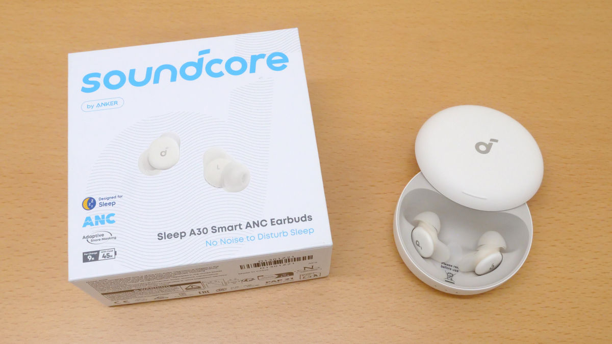 「睡眠用」と銘打たれたワイヤレスイヤホンです。睡眠時の低周波ノイズを効果的に遮断するノイズキャンセリング、高周波ノイズをブロックする遮音性に優れたイヤーチップ、横向き寝でも快適な装着感を実現するソフトシリコンと独自の軽量ウィング設計など、睡眠に特化したさまざまな機能が備わっているのが特徴。Ankerから提供してもらいました。
